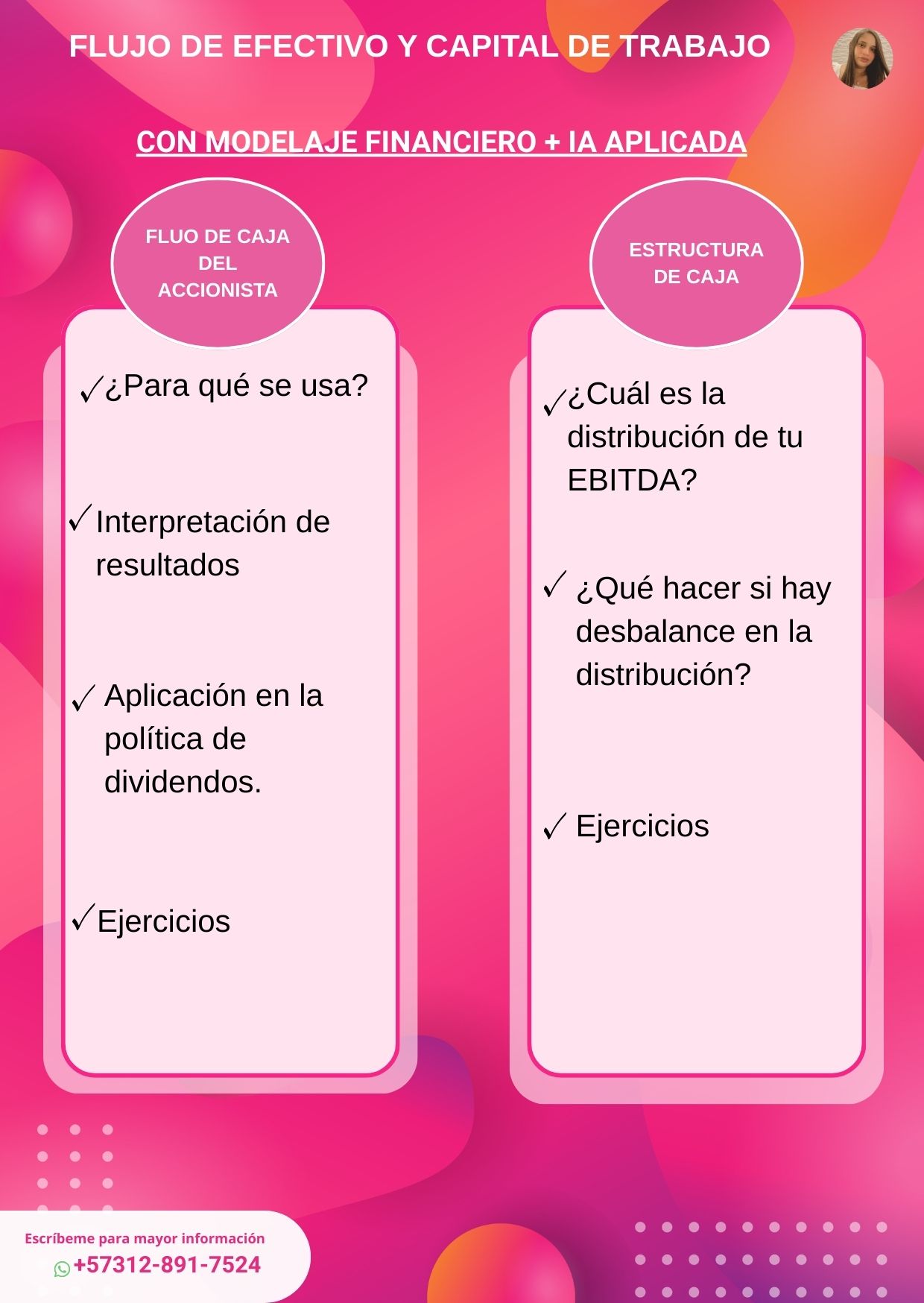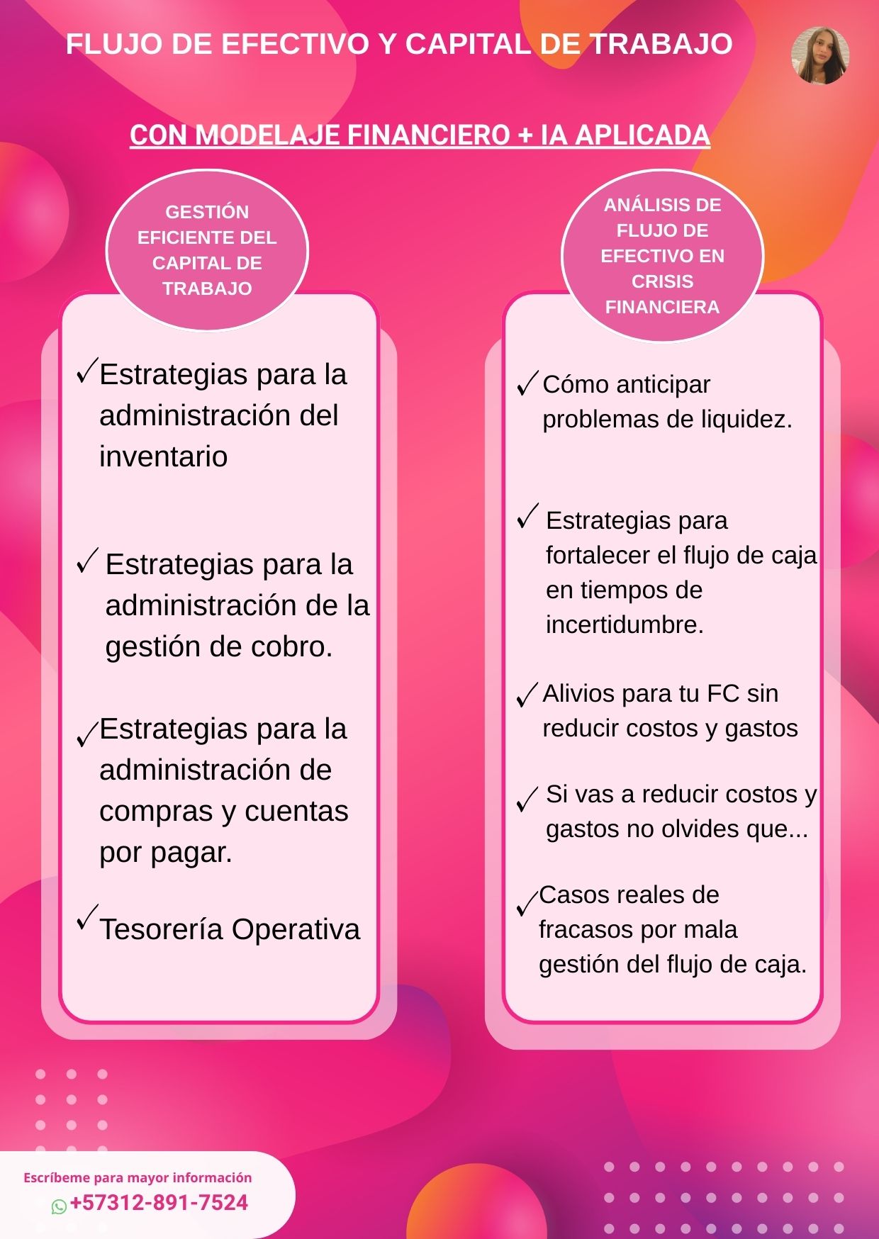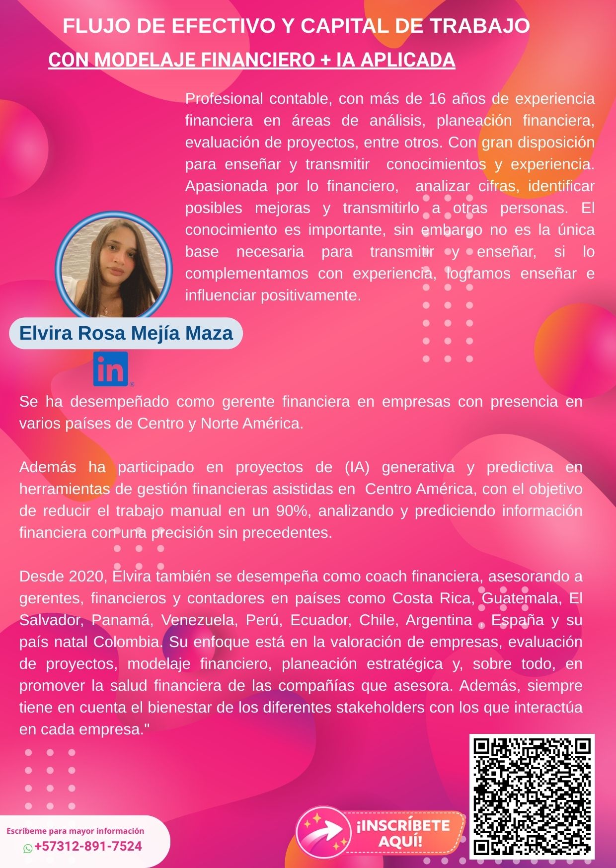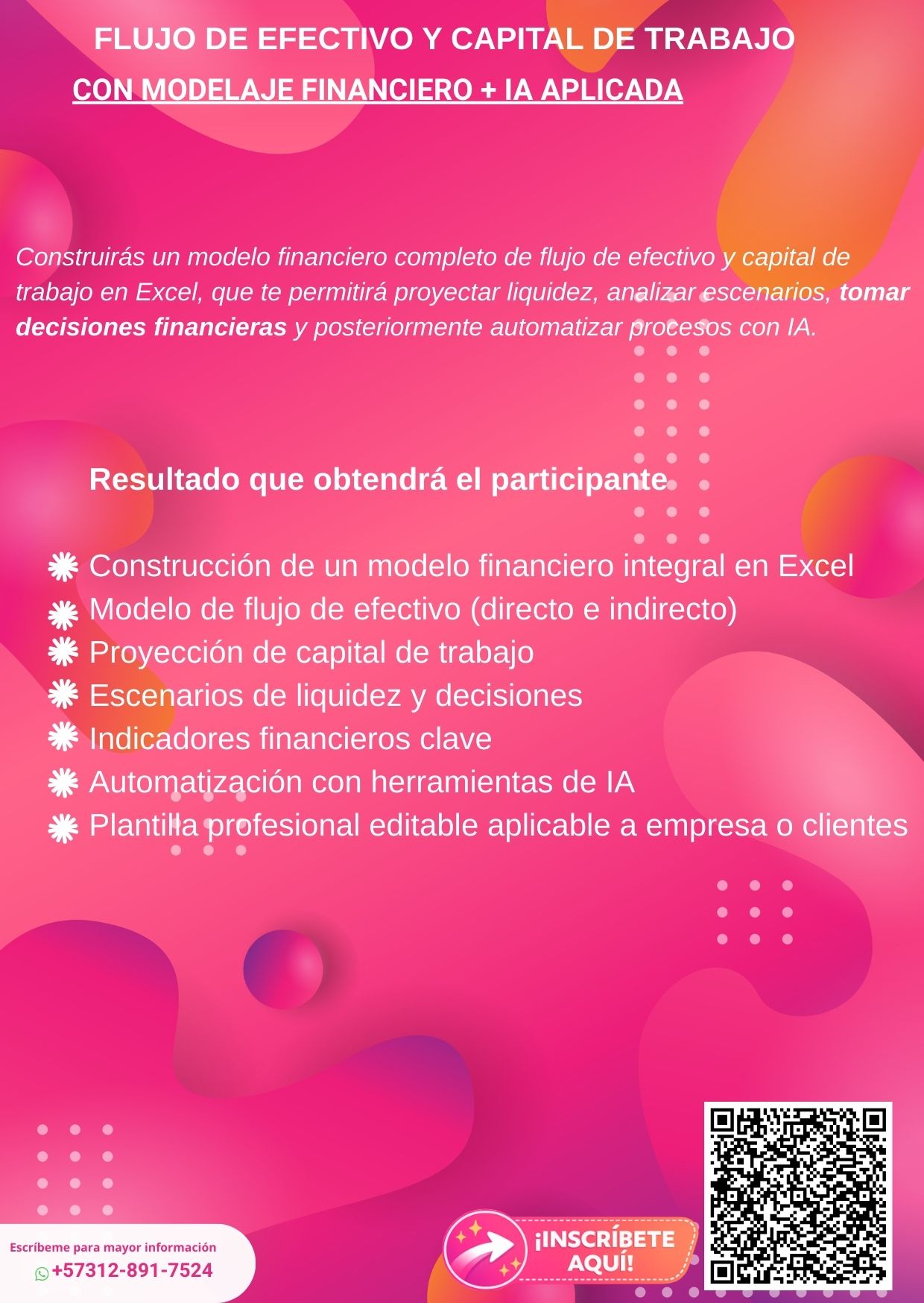 El objetivo del Taller “Flujo de Efectivo y Capital de Trabajo con Modelaje Financiero e IA Aplicada” es enseñarle a profesionales y emprendedores, sin lenguaje enredado, a entender cómo se mueve realmente el dinero dentro de una empresa: cuándo entra, cuándo sale, por qué a veces no alcanza aunque haya utilidades, y cómo anticipar problemas de liquidez antes de que ocurran. Los participantes aprenderán a tomar decisiones financieras estratégicas combinando lógica financiera clara, construcción de modelos en Excel aplicados al flujo de efectivo y capital de trabajo, análisis de escenarios y herramientas de IA prácticas para proyectar, sustentar decisiones ante gerencia o inversionistas, optimizar la gestión de caja y aumentar su productividad en el día a día.
